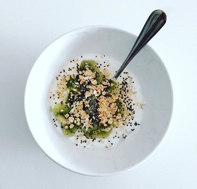 Le fameux granola alors ça dépend soit je le mets dans un yaourt avec des graines de chia, des flocons d’avoine, un peu de miel mais c’est plus rare et quand j’en ai envie je rajoute quelques fruits.