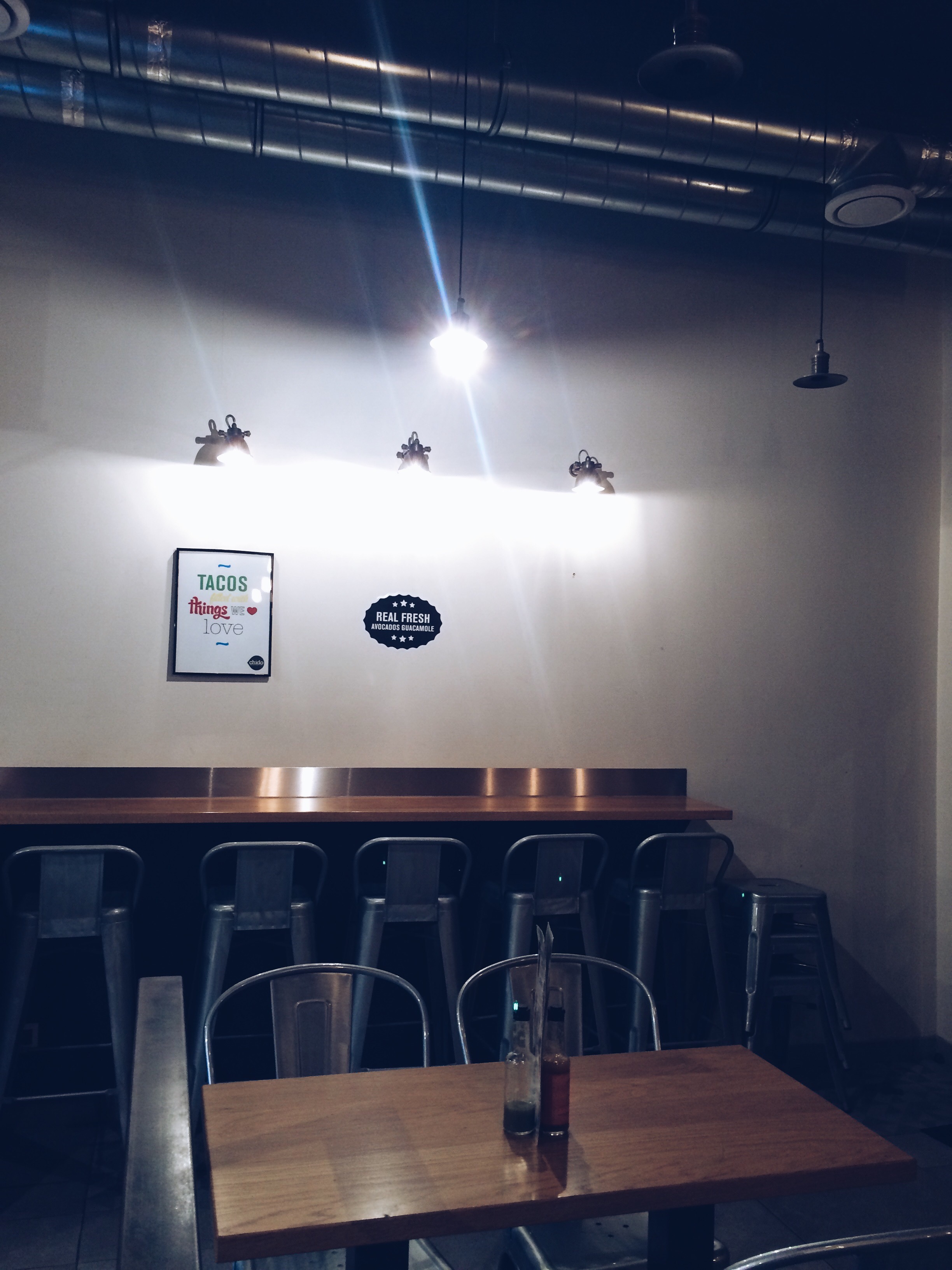 Concernant le lieu, on y trouve une ambiance assez sombre avec des lumières tamisées ainsi qu’un coin bar. La déco est dans l’ensemble assez moderne, ce qui selon moi ne colle pas trop à l’image de leurs spécialités. Heureusement qu’il y avait des musiques latines pour me faire voyager durant le repas.