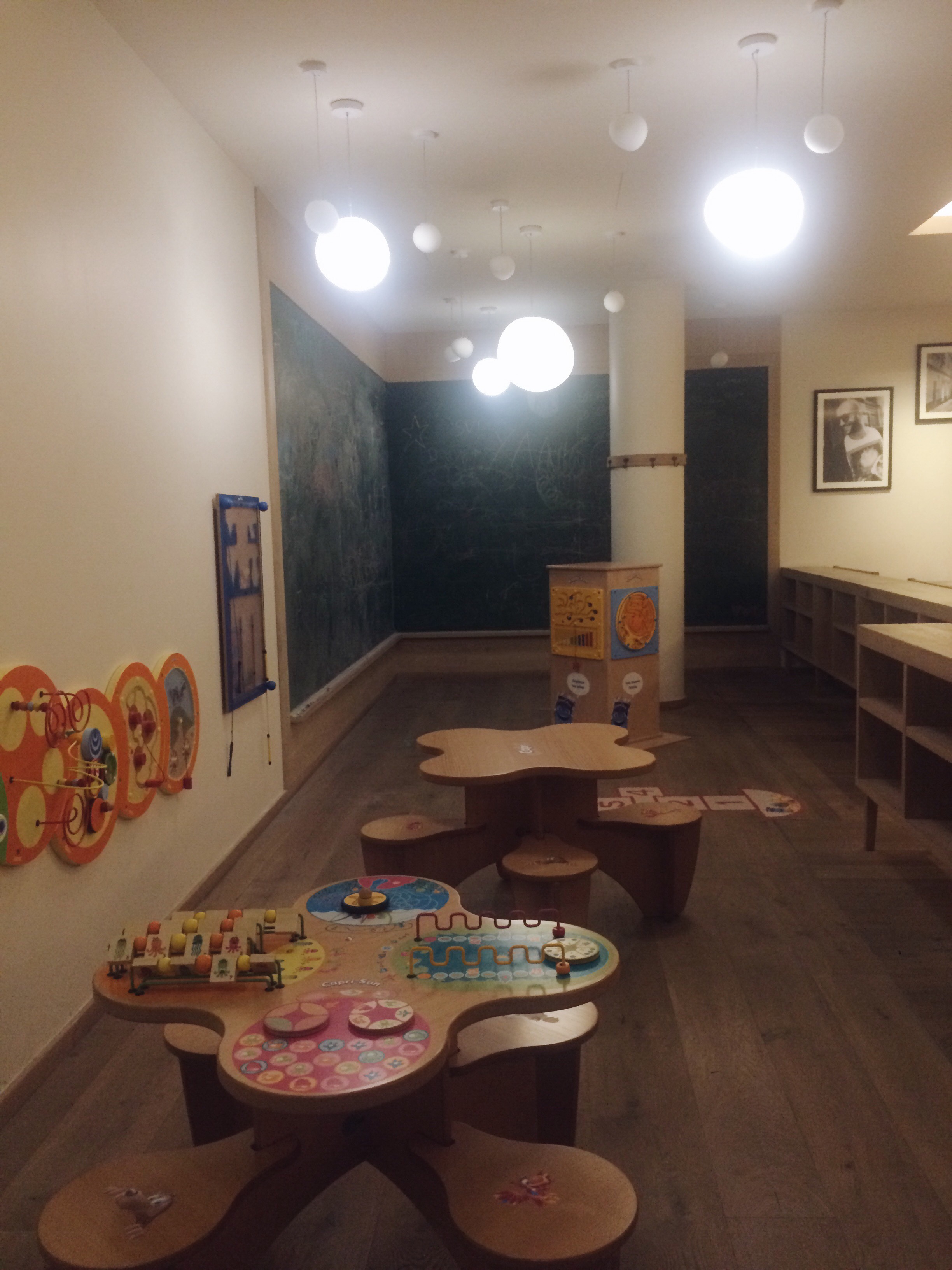 Avis aux parents, vous avez même un coin pour vos enfants dans lequel ils peuvent jouer ou dessiner sur le grand tableau.