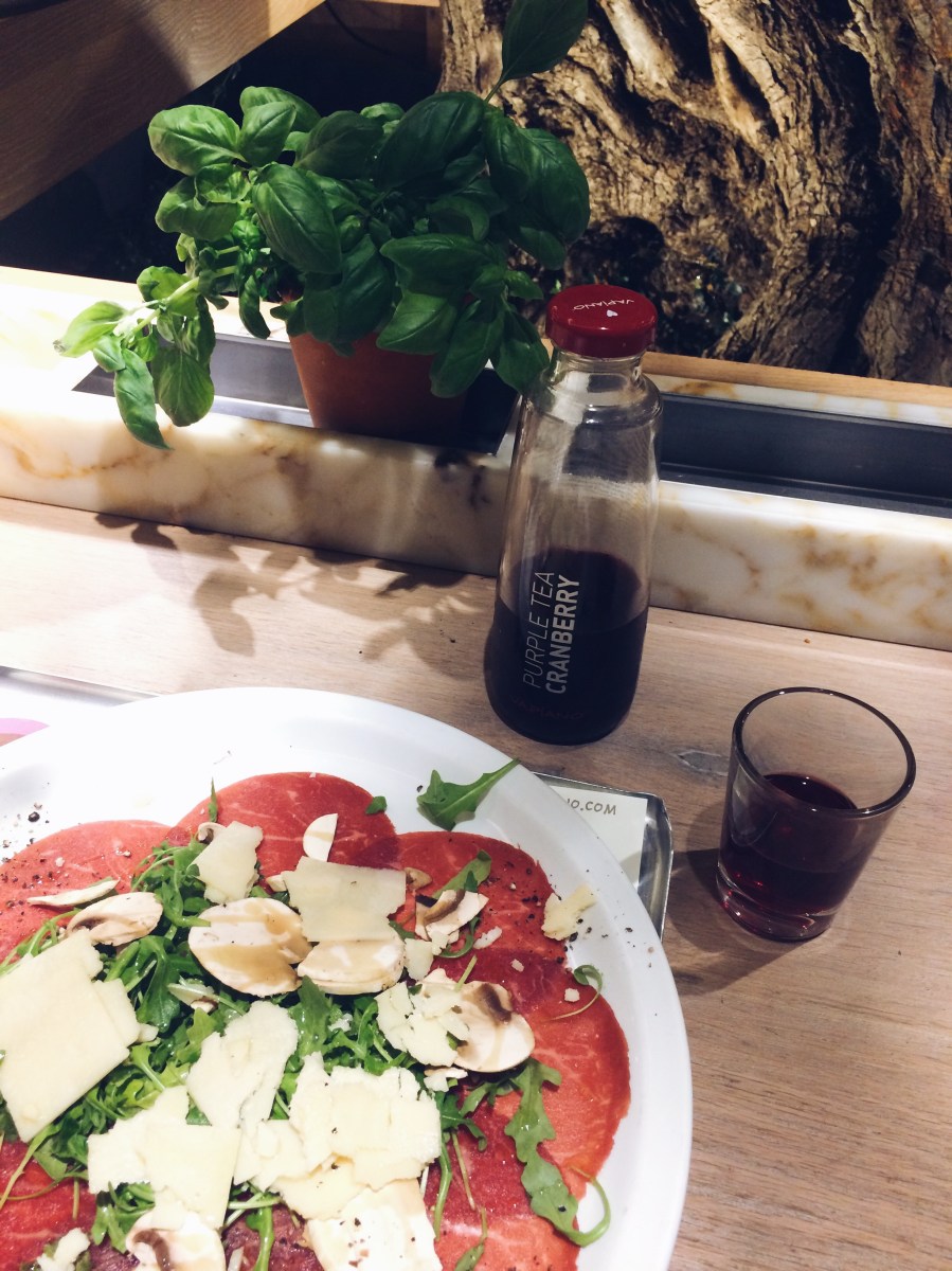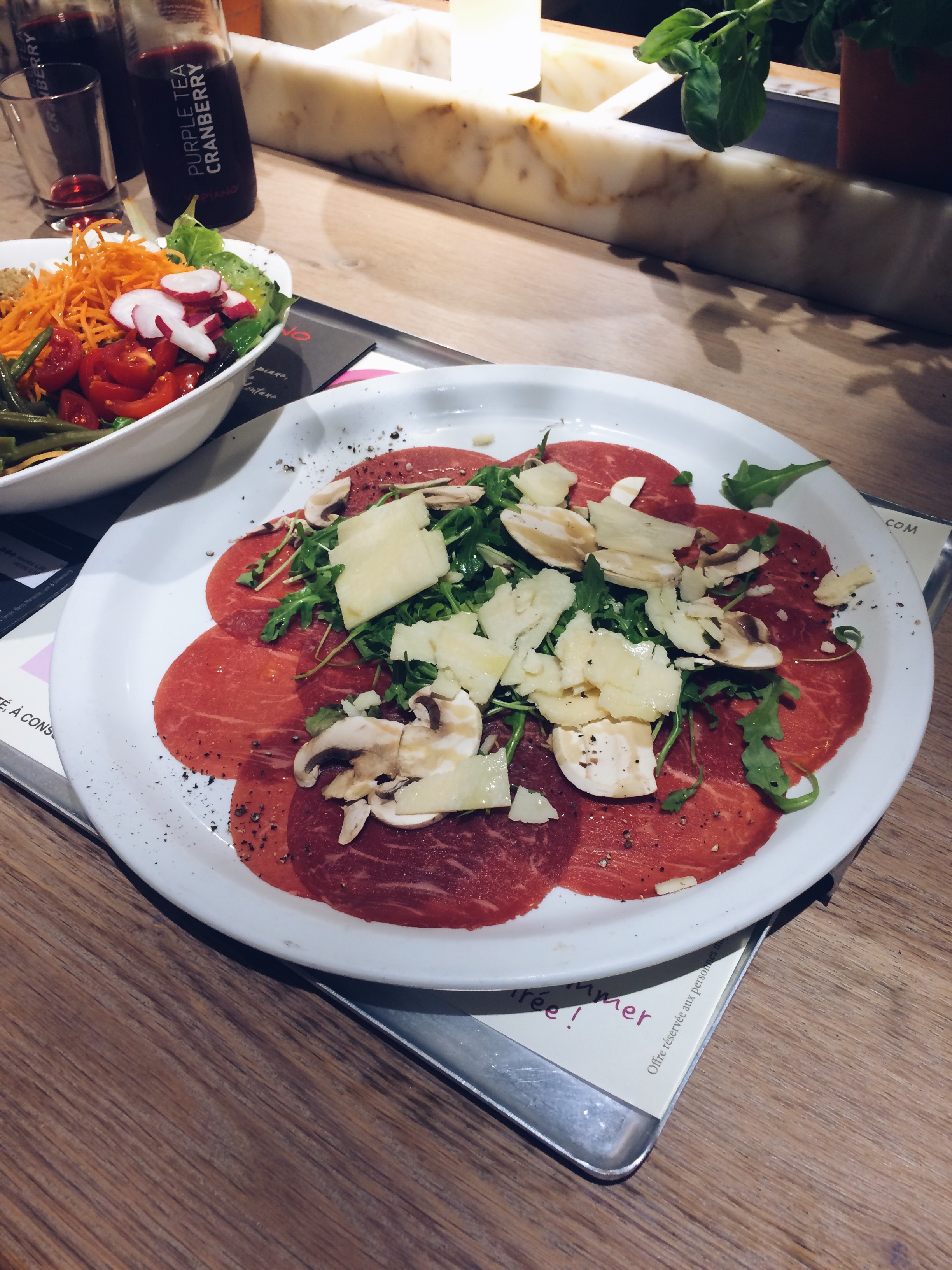 J’ai poursuit avec un carpaccio, aux herbes, parmesan et champignons. Il était bon mais j’ai du ajouté un peu de sel.