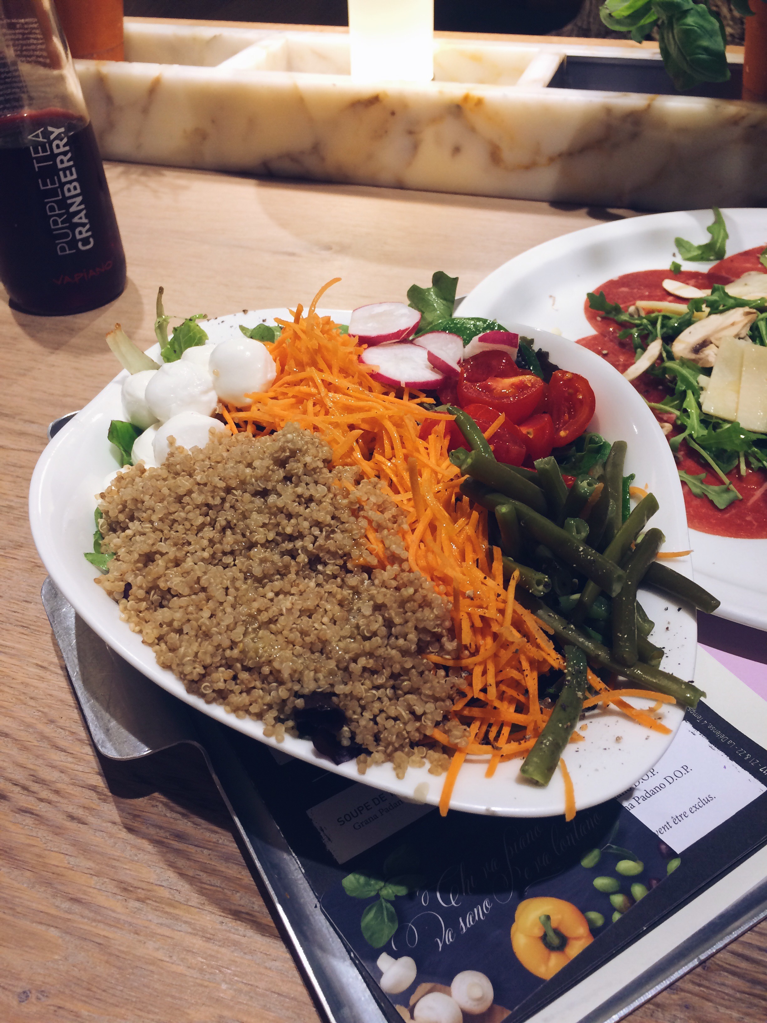 J’ai choisi comme plat, une salade composer de quinoa, carotte rappée, d’haricot vert, de tomates, radis, et de mozzarella. Comment vous dire, que cette salade était bien chargée ha ha ! Elle était bonne, les produits étaient bien frais !