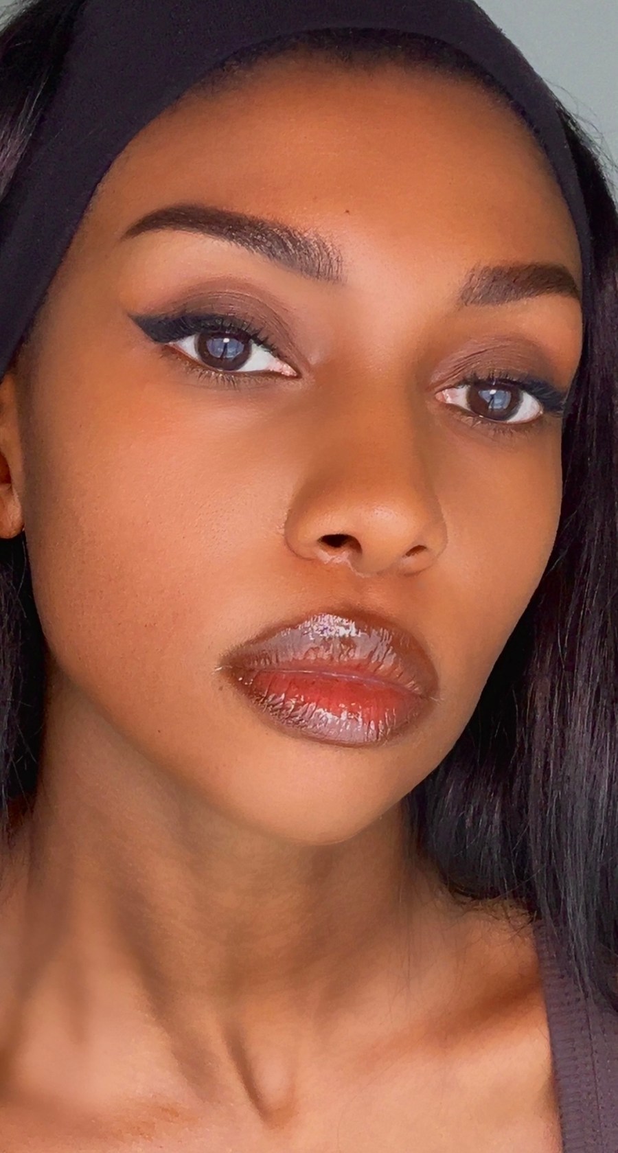Maquillage automnal simple : fard nude, eye-liner fumé et lèvres glossy au contour marron